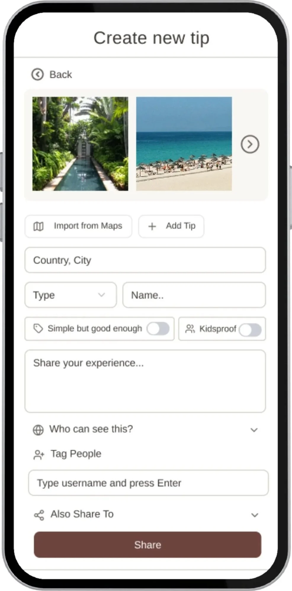 Share restaurants and hotels you've actually been and loved. Download the app for free and upload a tip in under a minute. Help friends, friends of friends — and, if you choose, the world beyond.